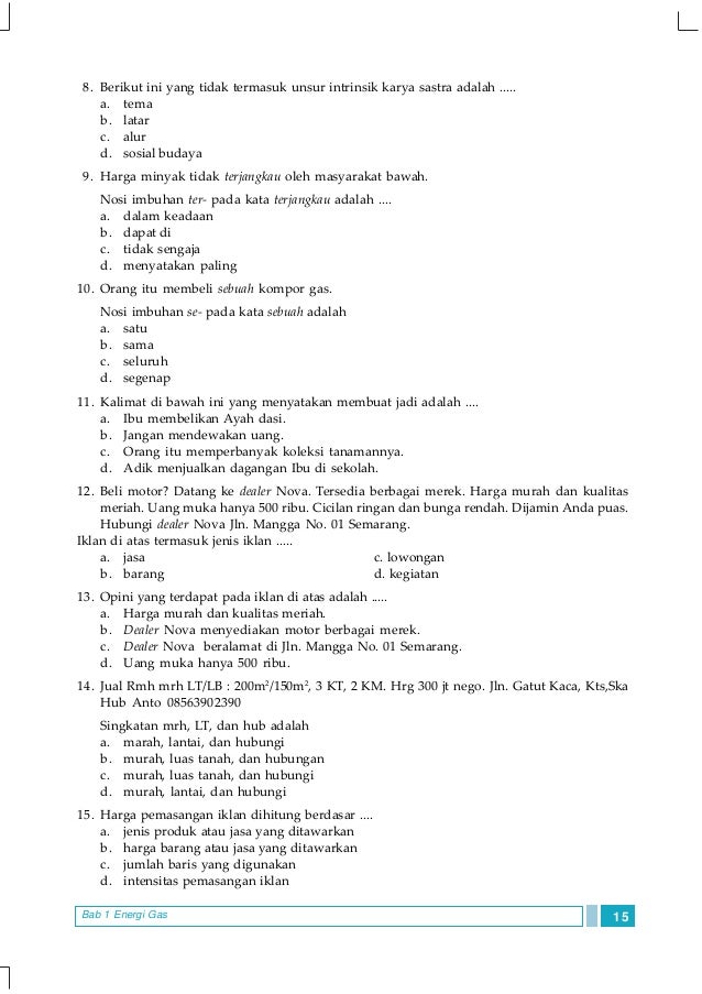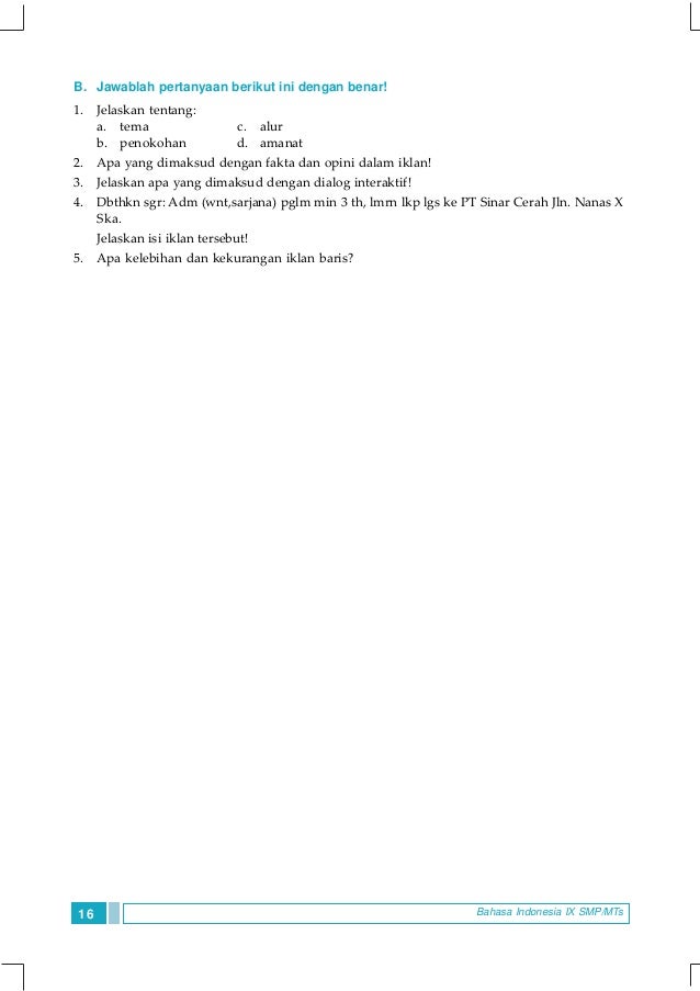 Makalah materi soal bahasa indonesia kelas 9 diterangkan mulai dari pelajaran sd, smp, atau sma min, mts, ma dan smk lengkap dengan contoh demikian pembahasan materi kita kali ini mengenai soal bahasa indonesia kelas 9. Gagasan utama pada paragraf di atas ialah … a. Simpansimpan bse bahasa indonesia kelas 9 untuk nanti. Indonesia untuk smk kelas xi tingkat madya. Berdasarkan hasil penelitian bentuk tes soal uji kompetensi pada buku sekolah elektronik (bse) ditemukan semua soal berbentuk tes objektif.